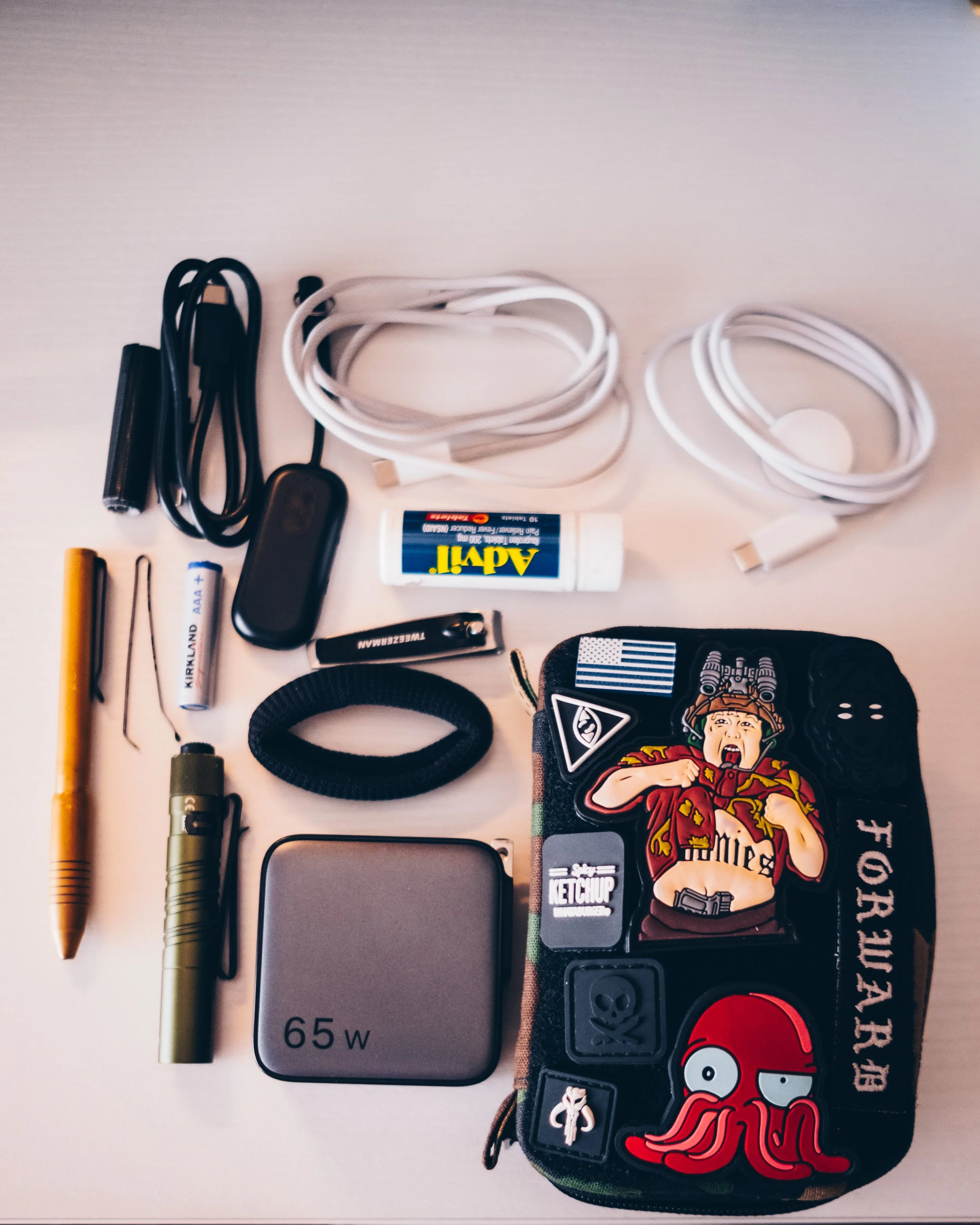 There are a thousand things one can put in a pack. Pens, snacks, reading material, the list goes on. Most people have a charging kit now a days. My charge kit is simple. It houses 1 power brick, 1 USB-C to USB-C cable, 1 USB-A to lightening, 1 USB-C to Apple Watch. I have my 3.5mm jack to BT dongle, perfect for flights, work, whatever it may be that requires I use headphones be able to use my AirPods Pro. I have some aspirin, a flashlight, nail clippers, a small roll of gorilla tape, a pen with blue ink, and a second hair tie.
